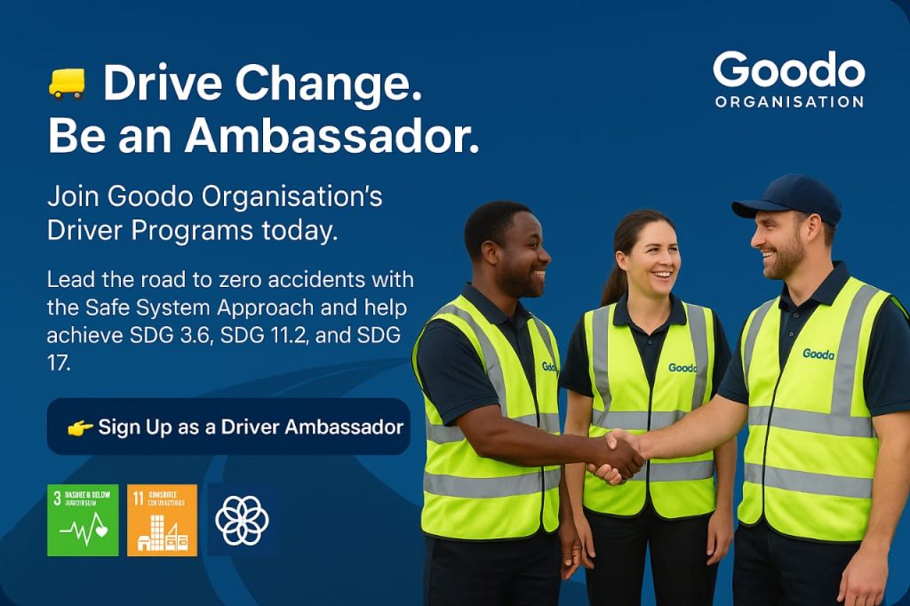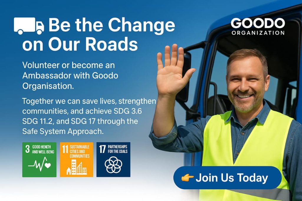 “Join Goodo Organisation as a volunteer or ambassador. Help save lives, make transport safer for all, and drive change through the Safe System Approach. Together we achieve SDG 3.6, 11.2 and 17 because every journey matters”
